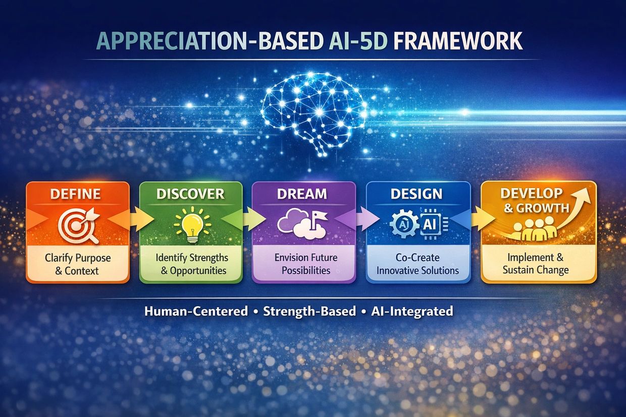 One of the most critical yet often overlooked aspects of organizational readiness is development and growth—especially when technological change is rapid and beyond our control. These interconnected areas form a core part of an appreciation-based, human-centered AI-5D practice.